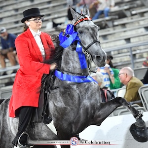 Five & Over Mares & Geldings (Canter), class 148, was next on the agenda. These talented entries went head-to-head as Judge Sisk called the class. With many world champions in the ring, many of these horses were not strangers to the winner’s circle. The nine entries came down and into the lineup. The three-time world champion in this class, Me And Pocahontas and Tyler Baucom were announced as the world champions in the division. Me And Pocahontas is owned by Allyson Armstrong of Hickory, North Carolina, and won earlier in the season at Walking In The Smokies, the Spring Fun Show and Walking For The Angels. This was the sixth world championship for Me And Pocahontas. Wearing the crimson streamer in the class was four-time world champion, Jimmer’s Country Girl and Josh Watts, riding for Carole and Lee Baxter of Alexandria, Louisiana. Jimmer’s Country Girl is a Heart O’ Dixie Spring Showcase winner and earned a world championship with owner Carole on Monday night. Earning the third-place spot in the good class was A Dixie General with Bill Callaway for Laura Mauney.