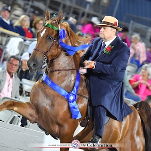 The last class of Wednesday night was also the last world championship preliminary of The 87th Celebration. From henceforth, there would only be world grand championship classes. Class 158 on the program was Walking Horses (Canter). The crowd cheered as seven entries came stepping down the hill and into the ring. Chris Bobo was the call judge. The Greatest Showman and Casey Wright took their first world champion ride as a team to the winner’s circle to wear the blue streamer and neck ribbon. The entry of Terry Lowman of Shelbyville, The Greatest Showman is sired by Walk Time Charlie. Ram Jam CTF and Charlie Green came next in the class. The entry of Dr. Steve Powers of South Pittsburg, Tennessee, Ram Jam CTF is sired by I Am Jose’. Finally walking to third was I’m Choobacca and Sam Martin, in the irons for Floyd and Caryl Sherman.